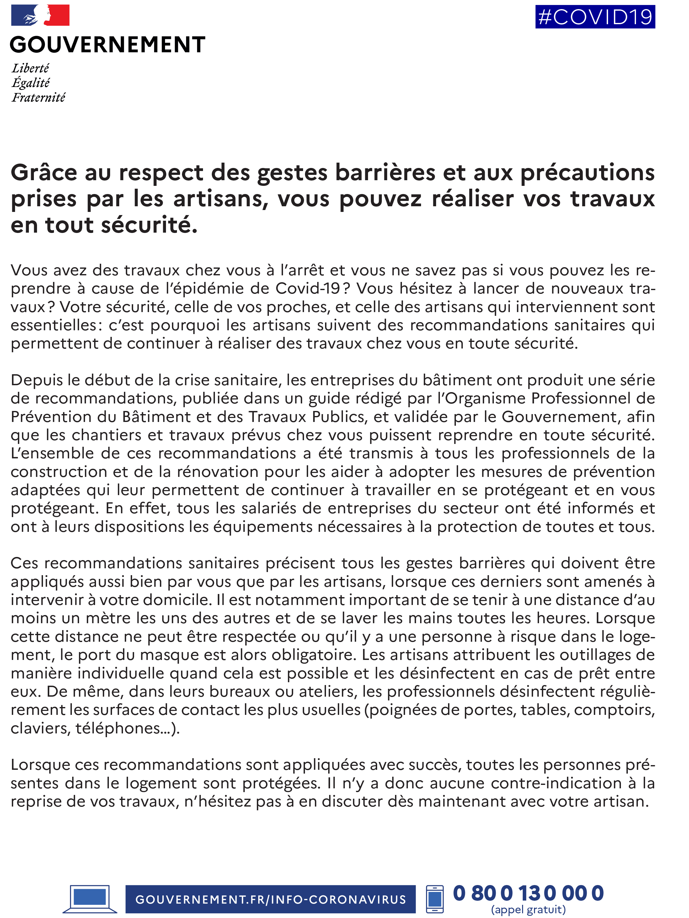 Découvrez ci-dessous la lettre partagée par l'État encourageant les clients particuliers à reprendre ou à démarrer des travaux en acceuillant des artisans chez eux. Utilisez ce courrier en appui de votre discours auprès des particuliers.